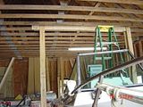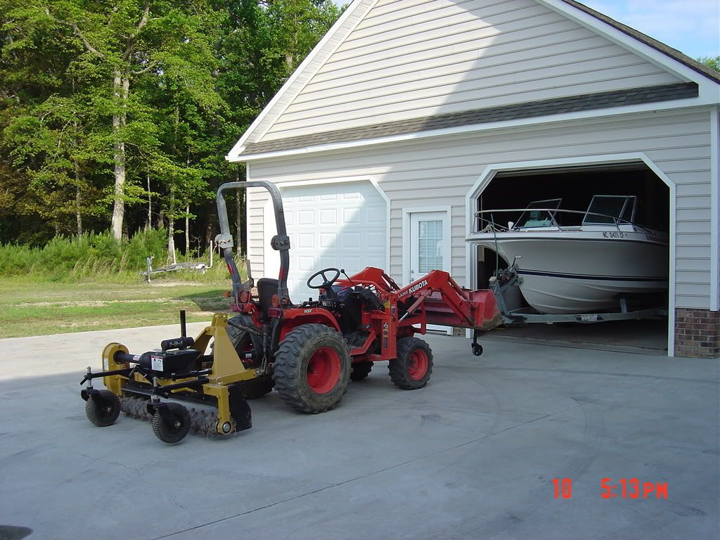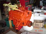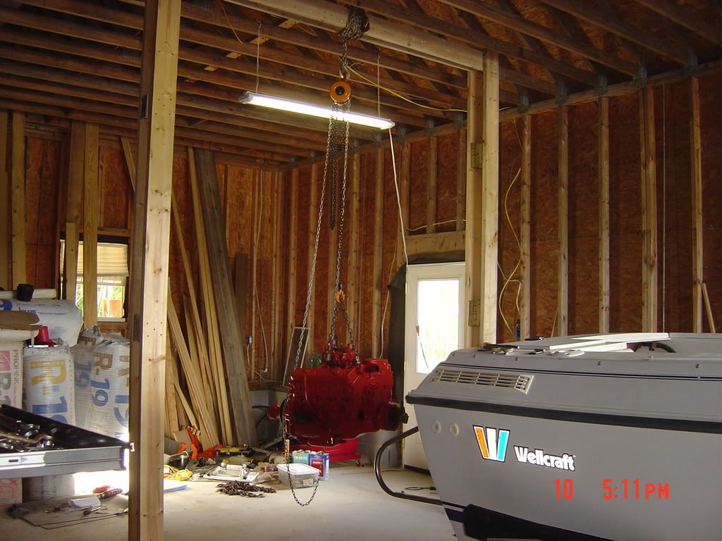 Ok Guys I've done some more work on the boat and here's afew pics to prove I've been working on it.  here's my REDNECK motor lift built on a truss.  Here's the new 350 replacing my old 305  Here's the painted bilge waiting on the new occupant  I pulled the boat out and moved the motor in line so the lift could pick it up and then I pushed the V back in and set the motor in place  Here's the little tractor that would I have the motor bolted in and mostly hooked up, I'm just having some problem trying to figure out the wiring for the alternator. I'm hoping to have it dunked and try starting this weekend. I'll take more pics as I get more time.