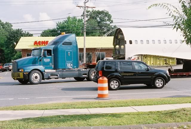 The 1st 5 pictures were from yesterday on Rt. 5 in Enfield Ct, the 2nd 4 are on Rt.5 in Longmeadow Mass about a mile from the 1st location. Any who talking to the driver it originated in Wilmington NC 12 days ago and going to Bridgewater Mass and Massachusetts State Police will not let the driver proceed because they don't have the proper permits. The fuselage is going to be used in the next Tom Cruise film.