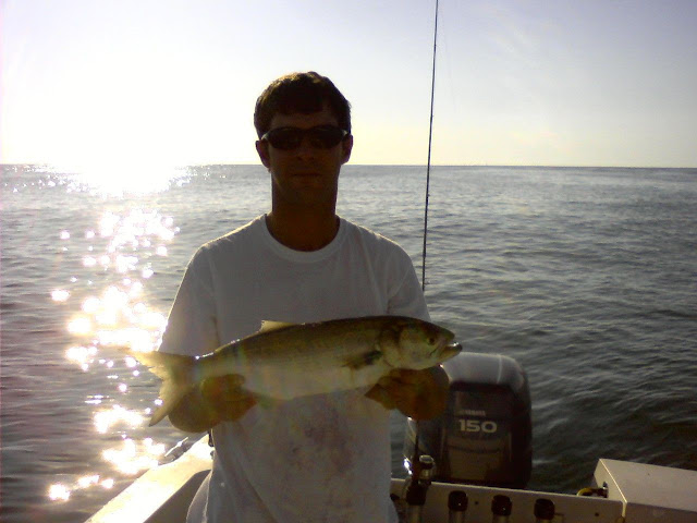 Me and Flyfishin fished inshore this weekend with good results. Got bait (finger mullet) first thing and proceeded to the inlet to set up. It was on as soon as the first line went in with Fly proclaiming the "hot hand" right before the big spanish pulled off just shy of the net. Note to fishermen: do not celebrate too early. [8D] Continued to liveline the FM and could not keep the rods from bending. Managed 2 big spaniards, and 2 healthy blues at that spot with a BIG mystery fish. This mystery fish beat all I had ever seen. My rod went off and I was having fun reeling in a 2 - 3 lb blue which ended up tangling in Fly's 2nd rod in the holder. He broke off about 20 feet off the stern, but at that EXACT moment Fly's rod (the line he tangled) bent over. We were laughing because we thought this blue had simply went from one rod to the other and we hoped the knotted line would hold him long enough to land. It became apparent about 5 minutes into it that the fish Fly had on was NOT the blue as there was some serious bend and the fish was giving Fly a run for his money taking more line than he could gain. Another 5 minutes and Fly had him on top, slowly gaining what the fish had taken when three dudes in a boat come 25 yards off our stern at about 8 knots, and run right over the fish. We hollered, pointed, jumped up and down to no avail. They looked at us, kept going same speed, threw their hands up in the air?? kept going as line was wrapped in their prop and just rode off into the sunrise. I don't know about you, but if it were me I'd #1, pop it into neutral if I saw someone jumping up and down and pointing like that and #2 at least check the prop if I KNEW I'd just run somebody over. GEEZ! Fly had some choice words for them as he retied. After that the bite fizzled out so we went after the sheepshead. Managed 4 sheeps from 2 to 4 lbs and a 5lb blue (released). Fly also hooked and fought a nice black drum right to the side of the boat before he spit the hook.... Next, decided to troll down the beach toward Surfside for spanish, then trout once there. Caught 10 spanish on the way there with a couple throw backs before switching to trout. Hooked only one trout which pulled off after a short tussle. At that point we decided to troll back to MI, picking up more spaniards on the way, a few keepers and a few throwbacks.