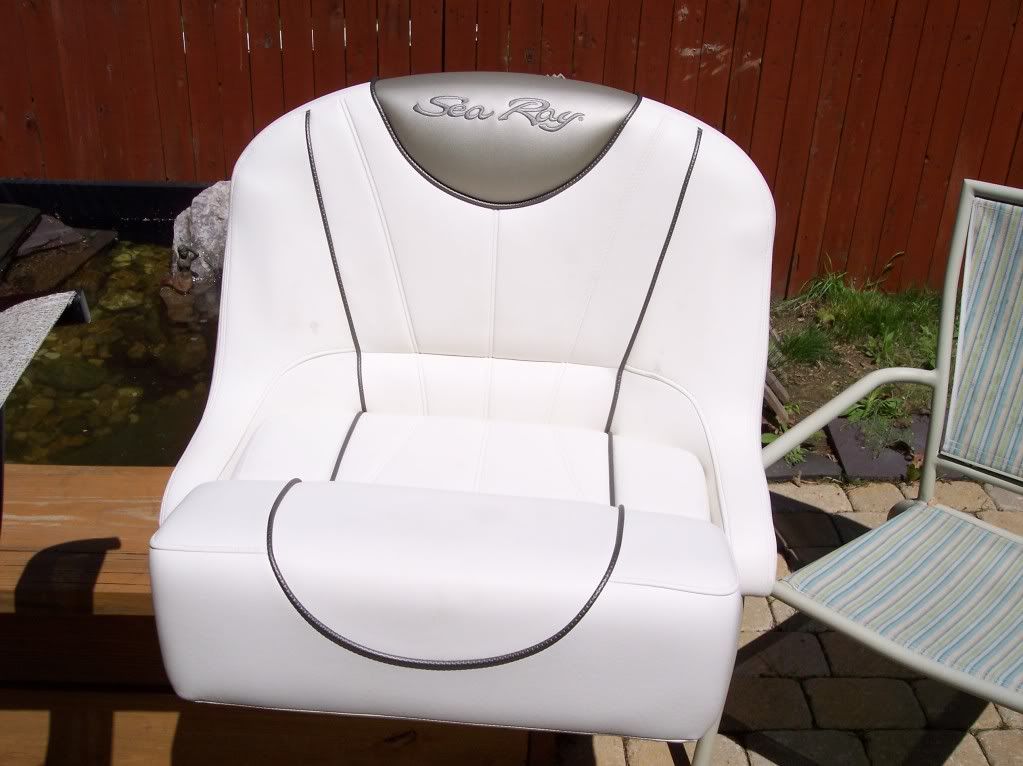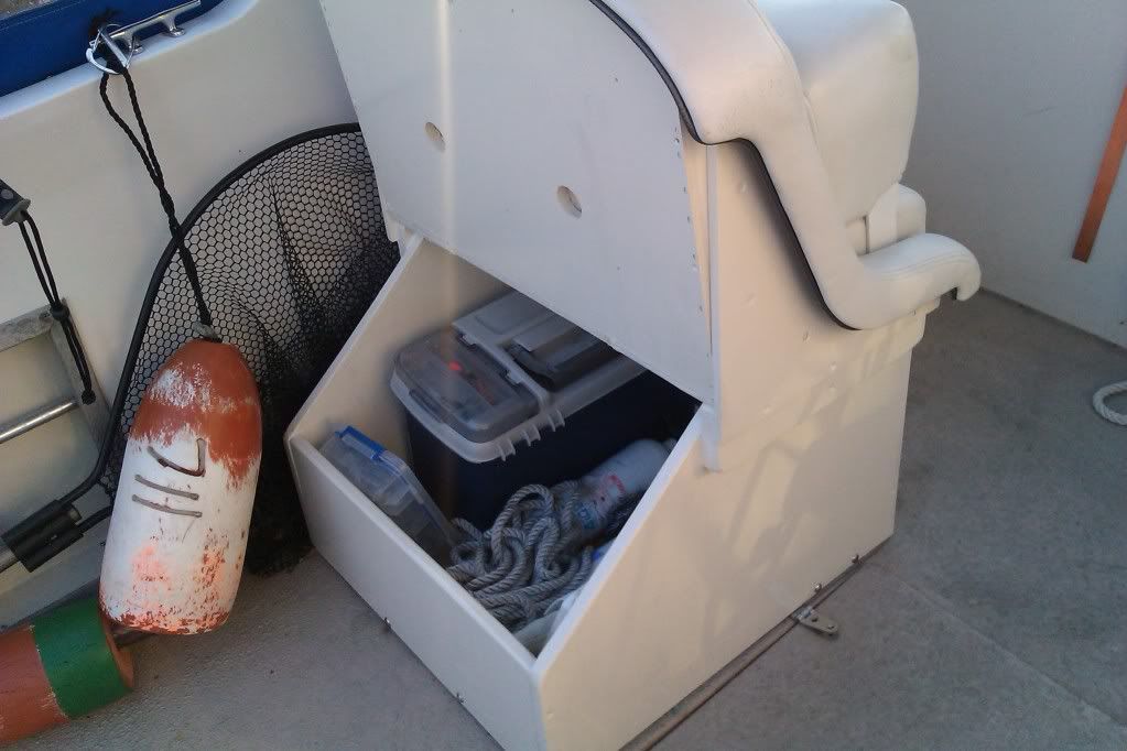 The best mod in my opinion! Bolster seats! Very comfortable, and you can stand and lean or sit and bounce. Great for all conditions. The seats are from Flounderpounder, I think. They were new surplus and came out of a 110 thousand dollar Searay. Very high quality.  I made the base it's just plywood with glassed over seams. The base works for storage. I am redoing the temporary base I used last year for the helm, once it's done I'll post more pictures.