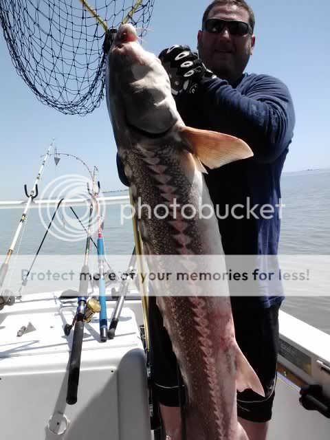The fish is a Sturgeon we have them in Georgia and but i do not think they are legal to catch here. Darien GA was known for its caviar was supposed to be better than Russian till they wiped out the population. They are making a comeback we See them often on the Ogechee and Altamaha rivers