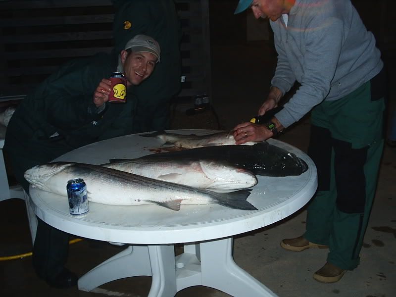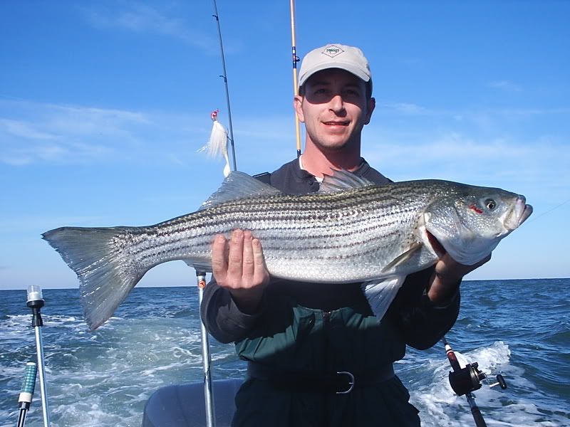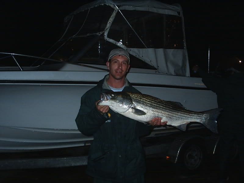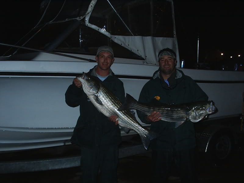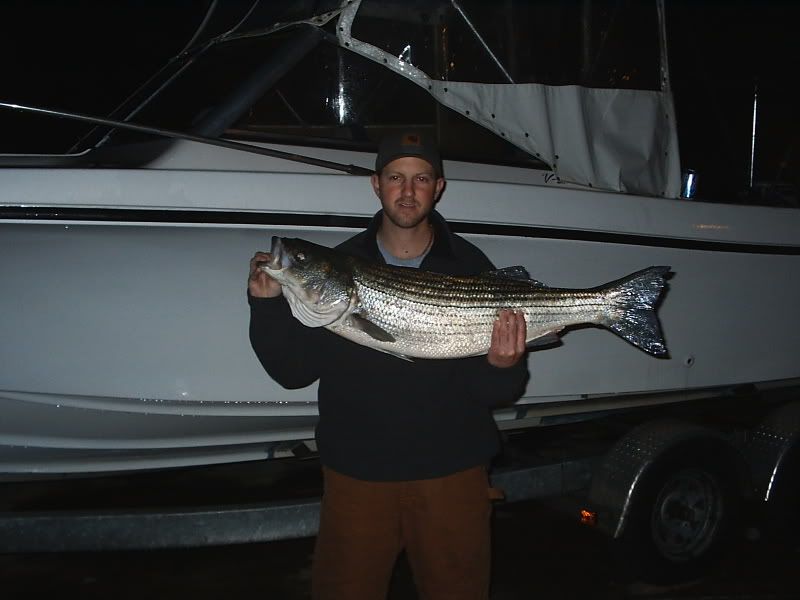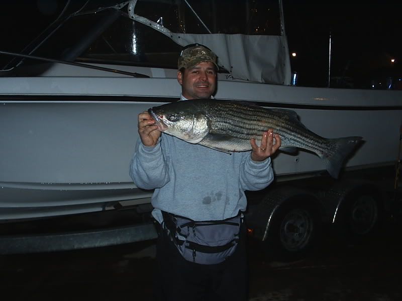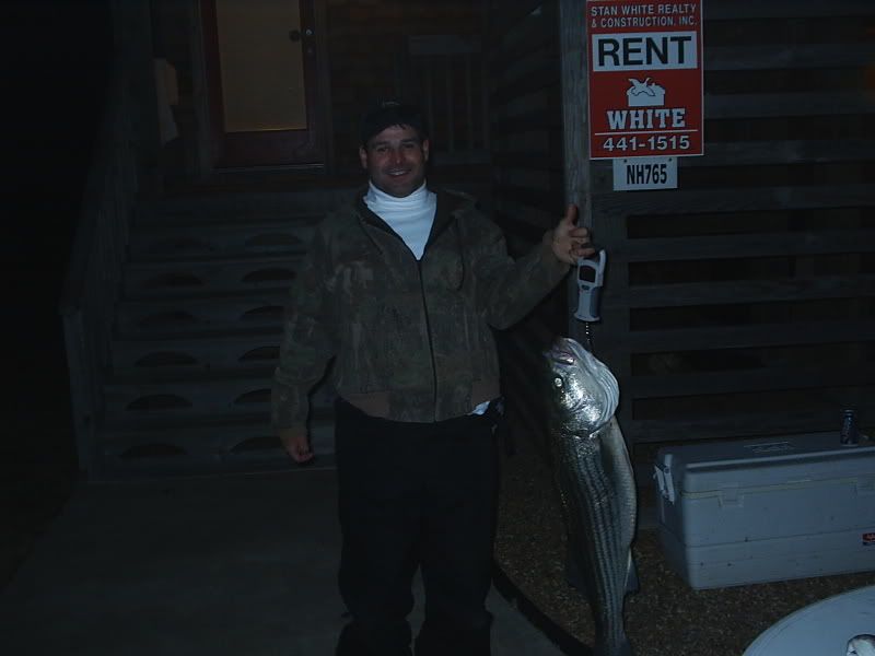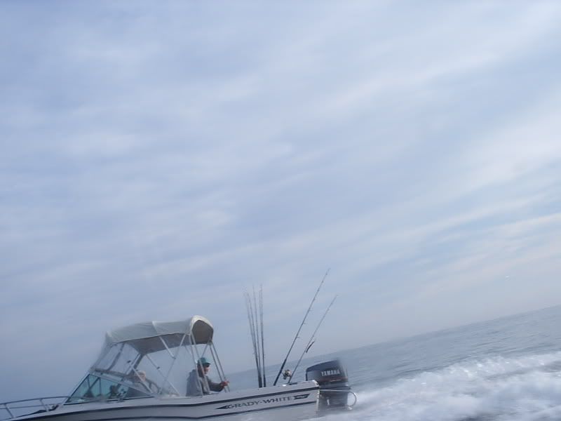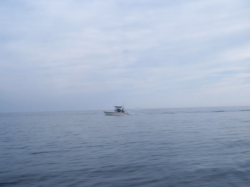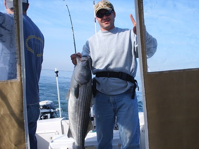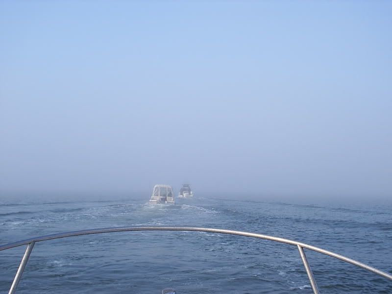 In an effort to take up some of Airslot's slack, me and 10 other guys headed to the coast last Wednesday evening to aid in the "natural selection process" in the stiper population that is heading down the coast. * Wednesday December 13th Knocked off work around 4:15pm. *Worked tirelessly all day Wednesday making sure everything on my checklist was packed and ready. *Toothbrush - check, deodorant - check, rods n reels - check, etc. etc. *Thank God for preparation. *I didn't forget a thing, which is quite incredible for me. *8) * We hit the road around 6:30 and pointed the full-sized doge east. *My wife and I only have one vehicle right now, so my friend Snead volunteered to pull the V-21 for me. *Nice guy, that Snead...also a striper virgin, but a nice guy nonetheless. Anyway, we arrived in Nags Head around midnight. *As soon as we arrive the plan was to lay down the law on a couple of cold beers while preparing the boat for the morning. *Remember guys, preparation is the key. * ;) So, we get the full enclosure on and pack everything into the boat for morning. *Fairly uneventful. *Alot of the other guys had already hit the sack - bunch of light weights. So, I get everything done and everybody hits the sack. *I wasn't quite ready so I stayed up for about another hour until 2-ish. *During that time while I was outside I decided to look at the stars. *Some of the other guys had already mentioned seeing shooting stars so I thought I'd try to see one.....well, I didn't see one. *I saw 25 + *!! *I stopped counting at 25 and must have saw 4 or 5 more after that before turning in! *This detail is important, as you will see later in this story. Was seeing 2 - 3 per minute with a few "earth grazers" mixed in. *Very cool *8) *After that, I hit the hay too. Thursday, December 14th Awoke around 6-ish. *Quick shower and brush my chops and walk outside. *In a word - FOG. *Dang fog, I hate it! *But, there was NO wind, which was very good. *So we decide not to get in any hurry and head off for some breakfast. *A little eggs, some sausage and gravy and all set. *Back to the room to purge the bowels and by 8 am we're heading to the ramp - stille foggy. At the ramp we get the boats in and started making our way out. *Visibility was not terrible but not good. *I think it was 1/4 mile - coulda been worse. *We know there's a shortcut to the inlet, but not having it marked and no boats to follow out we had to take the long way. ![]() ![]() Long story short, my buddy in his 19ft Grady White Tournament named "Runnin Rock Fish" makes a wrong turn and puts his boat up on a flat *snicker* *;D. *He trims it up and is shooting sand about 10ft in the air and we were pretty much rolling in the floor. *So he makes it off the bar and gets back in line. *At this point I'm leading. *Well, yours truly misses the turn for the inlet and we are heading for Pirates Cove *:o *But only for a couple hundred yards........before I put the SS Blue Runner up on a bar myself *>:( *Payback time, Joey and company in the Grady are now rolling in the floor laughing at me - guess we got what we deserved. *It was a very soft grounding, mainly the skeg, so we trimmed it up and made it off in no time flat and got back on track. We make it out to the bridge at the inlet. *The marker bouys are not marked on any of our Garmin GPS units. *Strange. *I thought they were? *So we have a fair amount of trouble finding the first one in the thick fog. *Then we found the second one. *Luckily, the inlet looked like a bathtub (what we could see of it). *Smooth, slick calm. *I stood in the cuddy with the hatch slid forward in order to find the markers. *We found them all and made it out. * Again, the ocean is smooth, slick and greasy calm. *So we decide to head north. *We headed north and headed north some more. *Making about 30 mph and 3700 RPM's we ended up 40 miles north and hadn't seen another boat, any birds - nothing. * A pic of the exited crew *::). *In the pic, we are doing 30 mph but it was so calm it was almost like riding in a car! My main man Corey on the right, Robin the bro-in-law on left. *I don't know where Snead is? ![]() Pic of my bud Joey's Grady under way: ![]() Pic of how the ocean looked behind the boat: ![]() I told the other guys that my limit would be 40 miles one-way and my buddy in the Grady also has a 150 with 62 gallons of gas so we stopped there and put the lines in around 10:30am. *The other boat with us, Kencraft Challenger 206 named "Two Moons" carries 90 gallons of gas with a fuel inject 200hp Evinrude, so they have a little more range than us. Had 3 knockdowns before noon and lost all 3 *>:( *Couldn't figure out what we were doing wrong? *Finally, we got one in the boat. *17.4 lbs. *Nice! *My brother-in-law Robin loses his linesider virginity! ![]() ![]() The next 3 knockdowns turn up to be big bluefish. *We gave them a quick release boatside and no pix, sorry. *I don't like to bring them in the boat. *They are so darn fiesty its not a good idea IMO to bring them inside the boat with those treble hooks flopping everywhere. Runnin Rock Fish managed 1 keeper as well and Two Moons lucky tail managed 6 somehow *::). A shot of Two Moons: ![]() Robins gesture of "#1" in the pic tells it all - we only caught one on Thursday. * Captain, proudly displays the catch: ![]() On the way back in around 5pm we fell in behind the sporties and were able to mark the shortcut for the next morning. Friday December 15 A new day has dawned and we decided that we must have missed the morning bite on Thursday. *So, the plan is to get an earlier start. *My crew didn't have breakfast on Friday, opting to eat a sammich on the boat during our 40 mile ride. *We end up at the fishing grounds about an hour and a half earlier than the day before - not bad. Lines in and off on the troll. *This day we got our fish to the boat. *Had 3 right off the bat with one being 19.5 lbs. *Again, there was a lull in the middle of the day and just as we were about to leave 