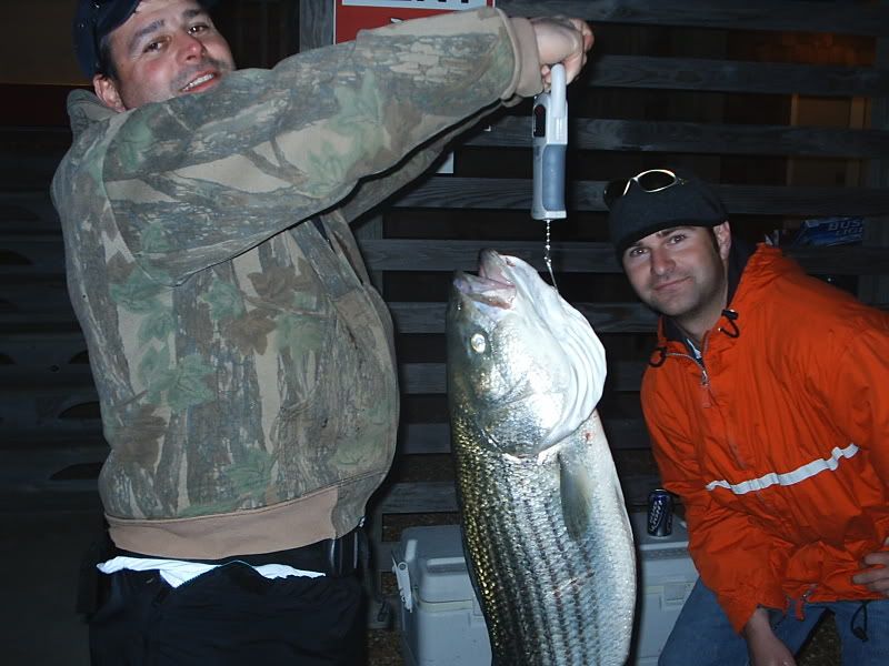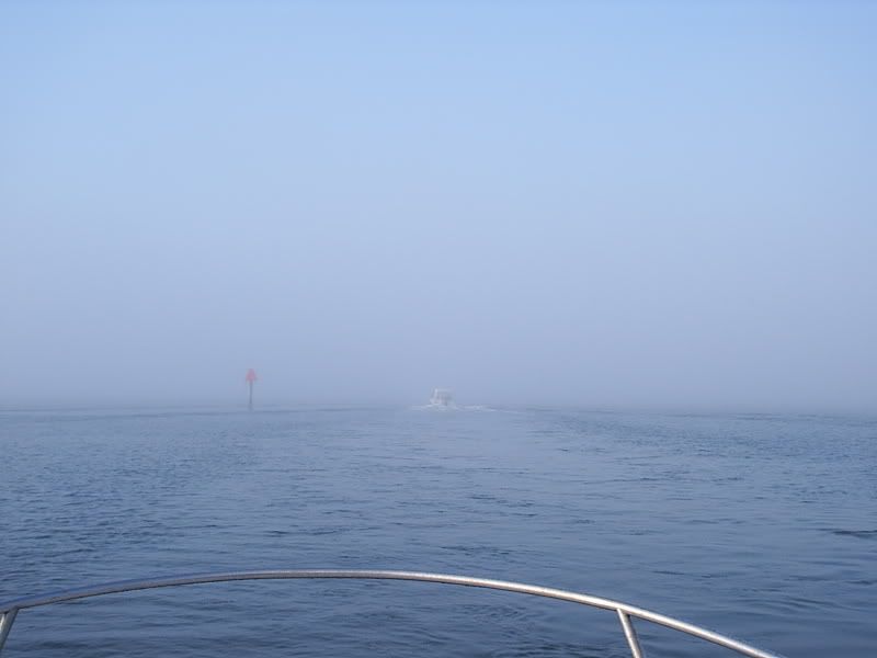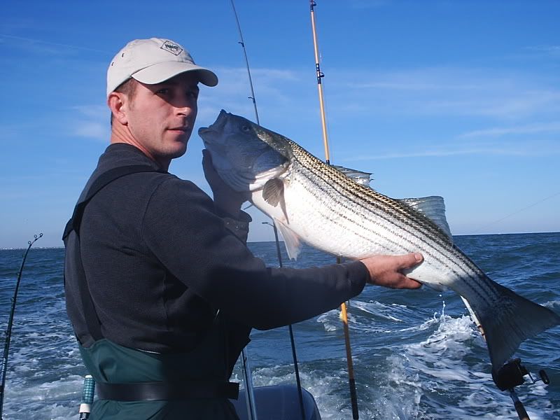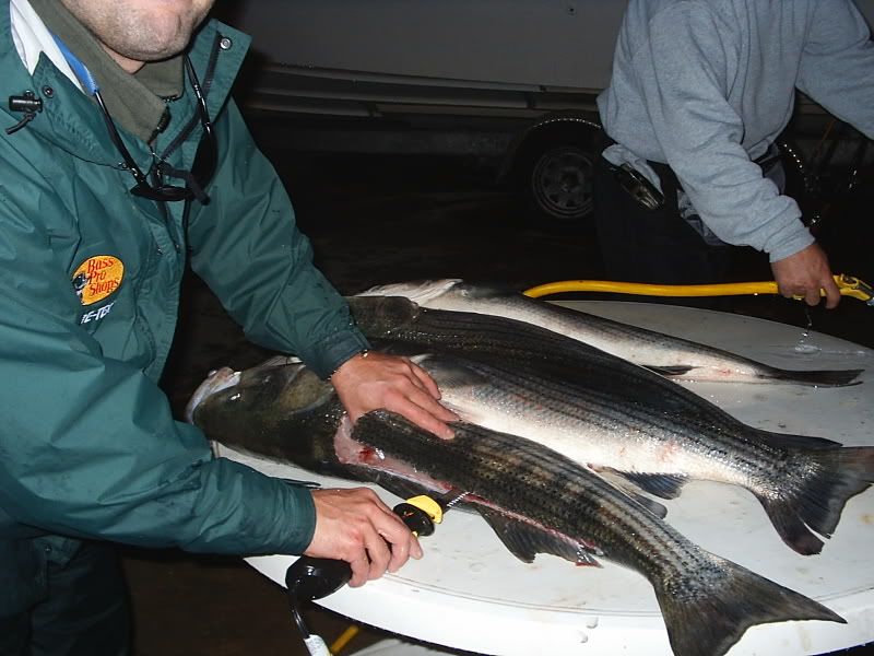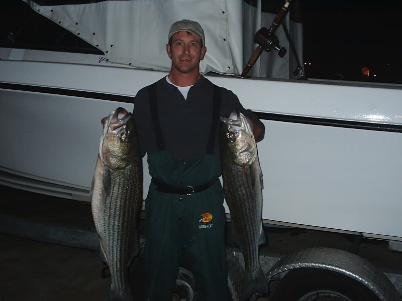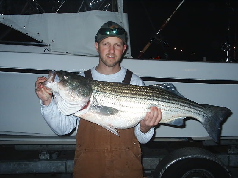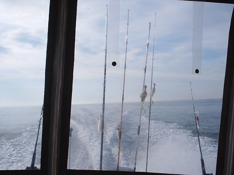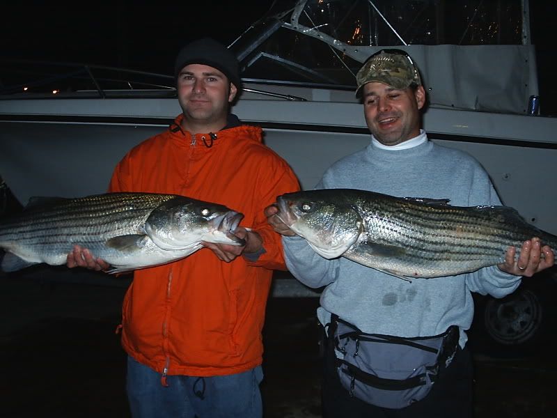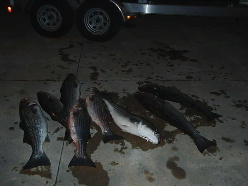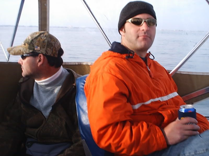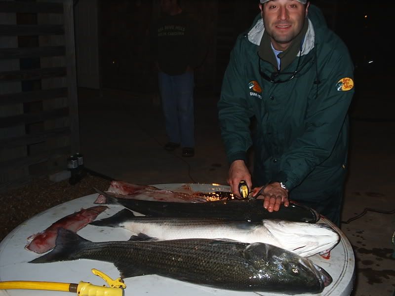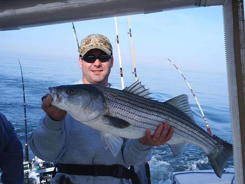 In an effort to take up some of Airslot's slack, me and 10 other guys headed to the coast last Wednesday evening to aid in the "natural selection process" in the stiper population that is heading down the coast. * Wednesday December 13th Knocked off work around 4:15pm. *Worked tirelessly all day Wednesday making sure everything on my checklist was packed and ready. *Toothbrush - check, deodorant - check, rods n reels - check, etc. etc. *Thank God for preparation. *I didn't forget a thing, which is quite incredible for me. *8) * We hit the road around 6:30 and pointed the full-sized doge east. *My wife and I only have one vehicle right now, so my friend Snead volunteered to pull the V-21 for me. *Nice guy, that Snead...also a striper virgin, but a nice guy nonetheless. Anyway, we arrived in Nags Head around midnight. *As soon as we arrive the plan was to lay down the law on a couple of cold beers while preparing the boat for the morning. *Remember guys, preparation is the key. * ;) So, we get the full enclosure on and pack everything into the boat for morning. *Fairly uneventful. *Alot of the other guys had already hit the sack - bunch of light weights. So, I get everything done and everybody hits the sack. *I wasn't quite ready so I stayed up for about another hour until 2-ish. *During that time while I was outside I decided to look at the stars. *Some of the other guys had already mentioned seeing shooting stars so I thought I'd try to see one.....well, I didn't see one. *I saw 25 + *!! *I stopped counting at 25 and must have saw 4 or 5 more after that before turning in! *This detail is important, as you will see later in this story. Was seeing 2 - 3 per minute with a few "earth grazers" mixed in. *Very cool *8) *After that, I hit the hay too. Thursday, December 14th Awoke around 6-ish. *Quick shower and brush my chops and walk outside. *In a word - FOG. *Dang fog, I hate it! *But, there was NO wind, which was very good. *So we decide not to get in any hurry and head off for some breakfast. *A little eggs, some sausage and gravy and all set. *Back to the room to purge the bowels and by 8 am we're heading to the ramp - stille foggy. At the ramp we get the boats in and started making our way out. *Visibility was not terrible but not good. *I think it was 1/4 mile - coulda been worse. *We know there's a shortcut to the inlet, but not having it marked and no boats to follow out we had to take the long way. ![]() ![]() Long story short, my buddy in his 19ft Grady White Tournament named "Runnin Rock Fish" makes a wrong turn and puts his boat up on a flat *snicker* *;D. *He trims it up and is shooting sand about 10ft in the air and we were pretty much rolling in the floor. *So he makes it off the bar and gets back in line. *At this point I'm leading. *Well, yours truly misses the turn for the inlet and we are heading for Pirates Cove *:o *But only for a couple hundred yards........before I put the SS Blue Runner up on a bar myself *>:( *Payback time, Joey and company in the Grady are now rolling in the floor laughing at me - guess we got what we deserved. *It was a very soft grounding, mainly the skeg, so we trimmed it up and made it off in no time flat and got back on track. We make it out to the bridge at the inlet. *The marker bouys are not marked on any of our Garmin GPS units. *Strange. *I thought they were? *So we have a fair amount of trouble finding the first one in the thick fog. *Then we found the second one. *Luckily, the inlet looked like a bathtub (what we could see of it). *Smooth, slick calm. *I stood in the cuddy with the hatch slid forward in order to find the markers. *We found them all and made it out. * Again, the ocean is smooth, slick and greasy calm. *So we decide to head north. *We headed north and headed north some more. *Making about 30 mph and 3700 RPM's we ended up 40 miles north and hadn't seen another boat, any birds - nothing. * A pic of the exited crew *::). *In the pic, we are doing 30 mph but it was so calm it was almost like riding in a car! My main man Corey on the right, Robin the bro-in-law on left. *I don't know where Snead is? ![]() Pic of my bud Joey's Grady under way: ![]() Pic of how the ocean looked behind the boat: ![]() I told the other guys that my limit would be 40 miles one-way and my buddy in the Grady also has a 150 with 62 gallons of gas so we stopped there and put the lines in around 10:30am. *The other boat with us, Kencraft Challenger 206 named "Two Moons" carries 90 gallons of gas with a fuel inject 200hp Evinrude, so they have a little more range than us. Had 3 knockdowns before noon and lost all 3 *>:( *Couldn't figure out what we were doing wrong? *Finally, we got one in the boat. *17.4 lbs. *Nice! *My brother-in-law Robin loses his linesider virginity! ![]() ![]() The next 3 knockdowns turn up to be big bluefish. *We gave them a quick release boatside and no pix, sorry. *I don't like to bring them in the boat. *They are so darn fiesty its not a good idea IMO to bring them inside the boat with those treble hooks flopping everywhere. Runnin Rock Fish managed 1 keeper as well and Two Moons lucky tail managed 6 somehow *::). A shot of Two Moons: ![]() Robins gesture of "#1" in the pic tells it all - we only caught one on Thursday. * Captain, proudly displays the catch: ![]() On the way back in around 5pm we fell in behind the sporties and were able to mark the shortcut for the next morning. Friday December 15 A new day has dawned and we decided that we must have missed the morning bite on Thursday. *So, the plan is to get an earlier start. *My crew didn't have breakfast on Friday, opting to eat a sammich on the boat during our 40 mile ride. *We end up at the fishing grounds about an hour and a half earlier than the day before - not bad. Lines in and off on the troll. *This day we got our fish to the boat. *Had 3 right off the bat with one being 19.5 lbs. *Again, there was a lull in the middle of the day and just as we were about to leave 