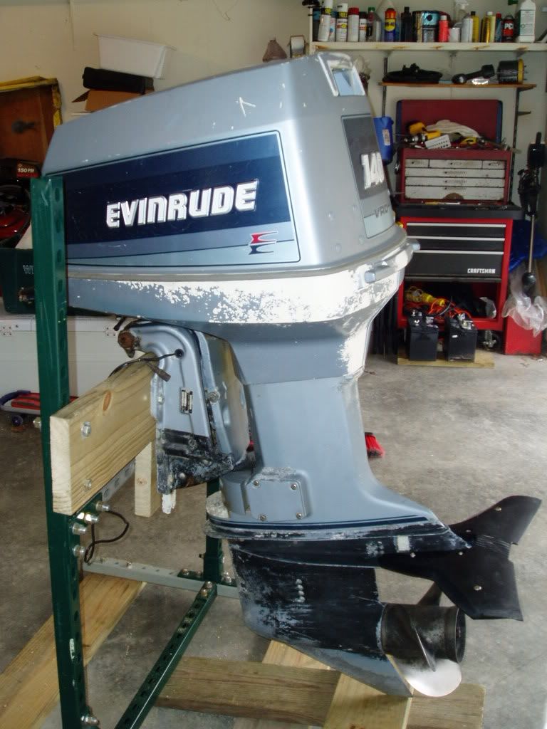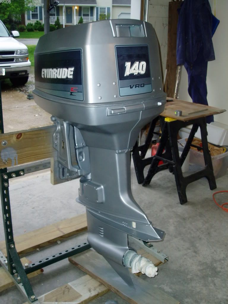 I figured I would post some before and after pics of my motor. I know we all like pics. She is an 85' 140 hp Evinrude. It treated me so good last year I figured I would give it a little spruce up. The color is the original. I sprayed 1 coat of zinc primer, 1 coat of multi purpose epoxy and 2-3 coats of the OMC topcoat. There was more prep to be done on it than I figured there was, that antifouling stuff on the lower unit was the worst.