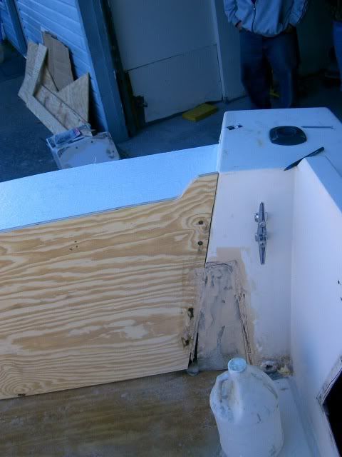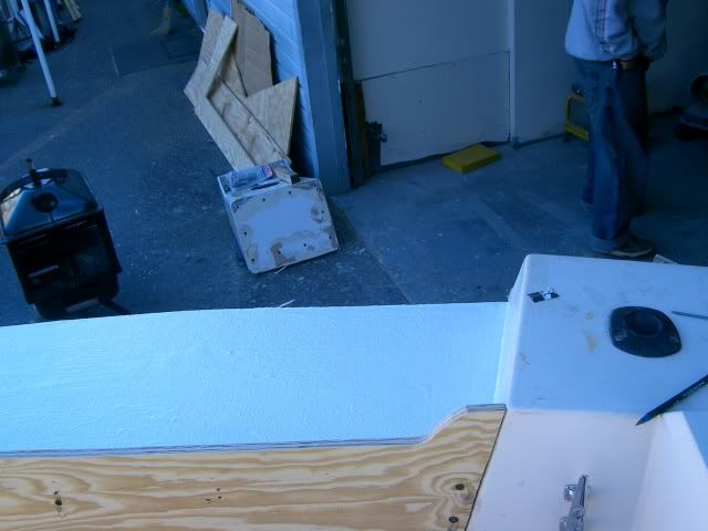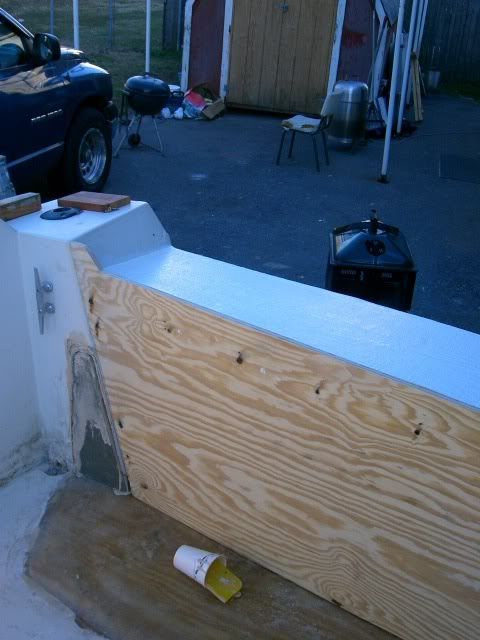 Went to visit the V-20 today to check on the progress so far. I brought the camera for all of you picture hounds. So far the deck has been installed and glassed in. He used a 2X4 frame screwed and glued to the stringers to support the deck (a little overkill I thought but it gonna move at all). The 2X4's are epoxied to the transom also. An 8X12 hatch will be installed for bilge access. I opted to make a removable bait station in the center section which explains the cut out area in the center. That is another project in the works. An access hatch will be put into front facade for access to the transom and mechanical areas.ENJOY :) :)