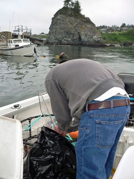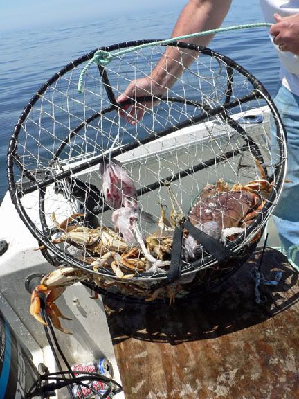 Leaving the port of Trinidad California. Adam is baiting a crab pot (dungeness crab season is open until 8/1) ![]() Pretty marginal ocean conditions ;D This is ~ 17 miles north of where we started. Dean is cranking one in. ![]() The TunaHead himself with a nice lingcod. These are NOT members of the cod family. Have no idea why they are so named... ![]() Friends Todd and Sean fishing nearby. ![]() One of the crab pots with a few Dungeness crab. ![]() The business end of a lingcod. Food goes in but it doesn't come out! ![]()