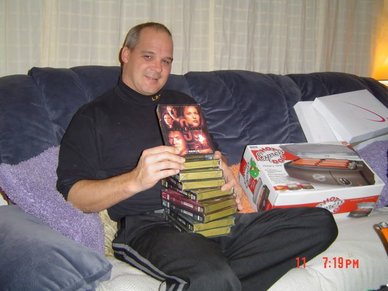 Oh what the hell. Figure I toss in a few more pics. Lisa with a few gifts. She loves those cooking shows.  Lisa got me....ah well nine full seasons of the X-Files. ;D Keep telling her how I was aducted by Willys alien super models. Not the fake smile, I was hoping for a braket. :-/