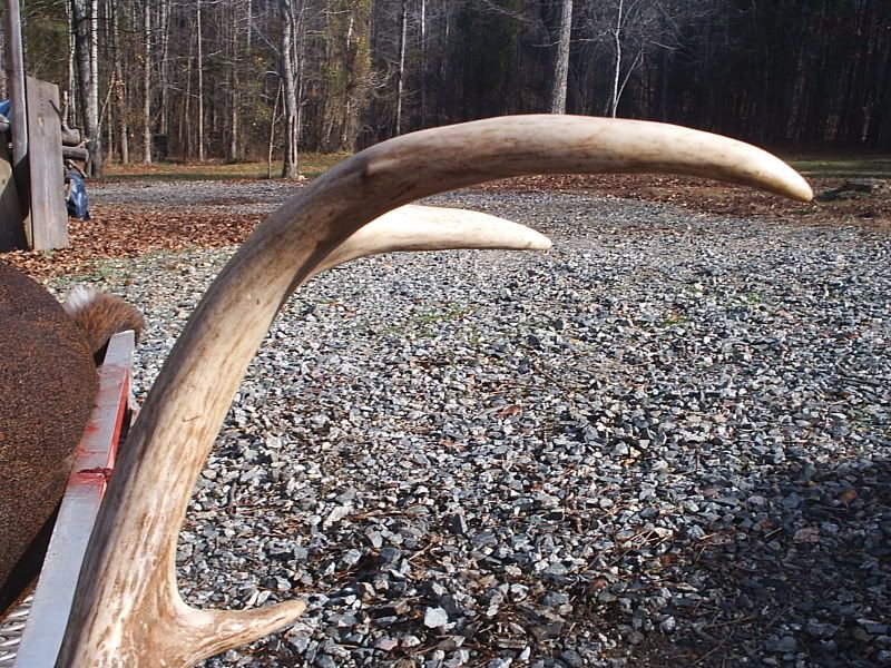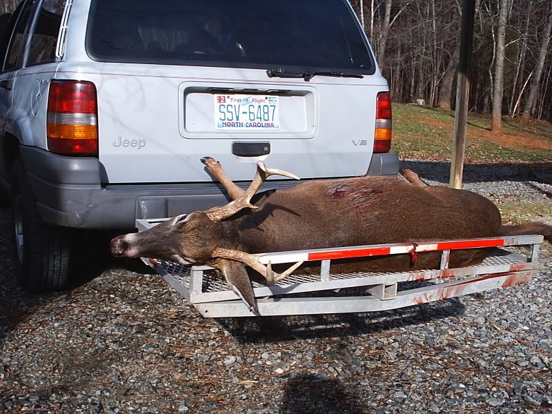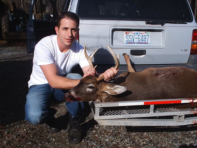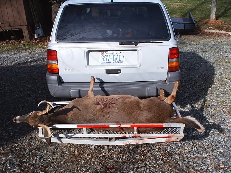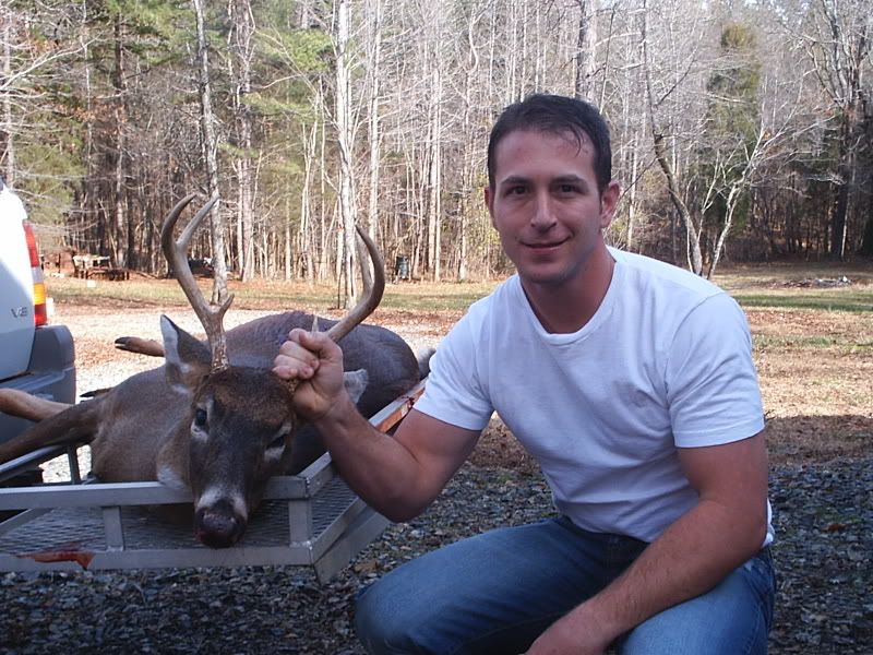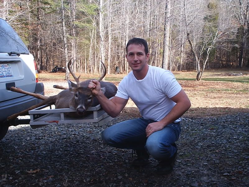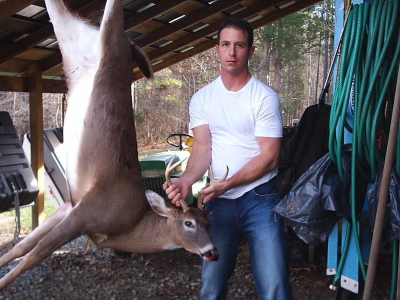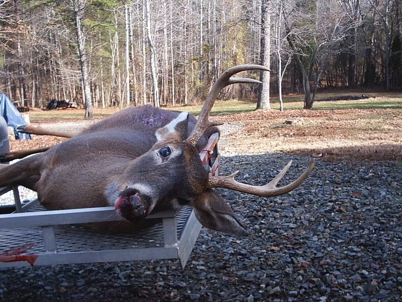 Alright all you picture junkies, grab a tissue cause its a sad sad day in BUCK LAND. Had a dentist appointment this morning at 9:20 am. Found out about it yesterday afternoon. Thought to myself, "Self, I guess there's no sense in driving all the way to work (40 min) if I just gotta turn back around to make your dentist appointment. You might as well just slip into the woods and hunt until about quarter til nine." I said, WOW self - that's a great idea! The next morning the internal alarm clock in me goes off loud and clear at 6am. I hit "snooze" (open hand right to the snaggers) and laid up for 10 more minutes, thinking seriously about not going hunting and getting some extra shuteye. After the 10 minutes I jump up ready to go. I've got a major hike to my hunting grounds - like 30 feet - so I have to really hurry to make it in time. I'm thinkin, "Self, its almost daylight! You shoulda been there by now!" Twenty more minutes peel off the clock and I'm almost ready to go. One last trip upstairs to top off the coleman thermos with fresh ice water to keep me hydrated during the morning hunt. It's now 6:30am and I grab the woodmaster 30/06 and pop a shell into the chamber before walking out the front door. Time for the grueling walk. Exactly 15 seconds later, I open the door to my stand. Which happens to be my small utility building about 10 x 12 with windows on each end. A small amount of light is creeping through the trees. I carefully close the door to the building and tippy toe over to my desk to sit down my thermos. Next, I plug in the electric heater and quietly have a seat before opening the window through which I observe my feeding lane. By the way, so far I've only threw out two 50 lb bags of corn and 1 and one half bags of apples spread over 2 feedings a week apart. After all, this insn't my main hunt. Or should I say "wasn't"? I'm all settled in and ready to see some deer. I know they are probably on the way based on the last several times I've hunted. The question is, will they arrive before my sister comes to pick the kids up from school at 7:50 am? The answer is, no. Actually, when my sister started down my driveway, a big buck walked hastily accross the back part of my feeding lane. I quickly got ready and put the crosshairs in his direction. I can see he's nervous about my sister's van, who just blew the horn twice mind you, and is now sitting in the driveway running waiting on my kids to come out. About 3 seconds pass and I think twice before electing not to shoot through branches and trees. Three more seconds and his head and neck are in a perfect little clearing, head high and staring back toward the running van. I put the crosshairs right on his adams apple and proceed to squeeze. Half way in the trigger goes....steady.....then he drops his head and moseys on off. I'm cursing myself. "Why didn't you shoot self?? Self - you are the biggest dummy! I knew I couldn't count on you - you idiot!" And to think - I'd just been bragging about how I like my trigger because it has such a good feel to it. So, at this point I'm ticked at my sis and MYSELF. I know I have close to an hour left to hunt, but my experience says you just won't see the nice buck twice in one day. Especially after he's been spooked. Only 10 minutes pass and 4 does come in from the direction the buck exited. They feed for 30 minutes without a care in the world and walk off in the opposite direction - away from where the buck went. I'm still mad as fire but encouraged by the fact that deer came from the direction the buck went. 8:45 am. I'm getting ready to leave, dreading the dental cleaning because I don't floss like I should and all of a sudden a large doe comes flying out from the direction of where the buck had gone and crosses my lane without even thinking of feeding. I say, "Self, she's probably running from that nice buck so get ready!" I grab my hearing protection and steady the rifle. The doe is still within site but looking jittery. Not a minute passes and here he comes - right behind her! Its the same buck I saw an hour earlier! He's not interested in feeding so I know I must act at the right moment. A couple of steps into my lane and KABOOM! He jumps and trots off like he's unfazed. I went ahead to look for him since I was short on time. Followed a good blood trail about 30 yards and see him laying there. Its a nice 6 pointer! I hoped he was bigger, but this will do any day for me! Nicest buck I've killed in years! I proceeded to drag him the whopping 40 yards from the house. I used my jeep to take it next door to dad's house. I had to wait around at his house for about 30 minutes for him to come home from work to help me get him hung so I snapped some pix while I waited.    Then when he got there, he took some pix of me posing. ;D    Got him hung!  This shot shows what looks like the beginnings of a drop tine? See it?  Here are the other 2 bucks I've taken over the last week and a half. The one I thought was a 5 point is actually a 4 point. I didn't notice the missing brow-tine on the one side til today. The other is the small basket 8 pointer from Saturday.  The 8 point rack looked kinda like a small moose rack. Perfect for a jackalope!  Hammer man, sorry there are no action shots. I was trying to get a pic of the bullet going in but couldn't reach the cam. I'll do better next time ;D