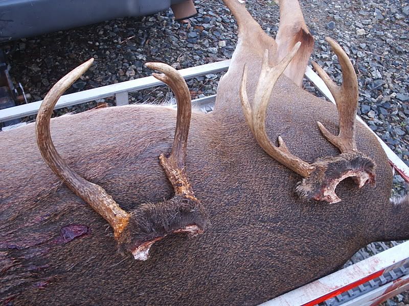 I don't think I mentioned this but I had to leave the deer until after the dentist. I got done at the dentist at 10:30 and had to wait on dad til 11:00. Then had to clean by myself and got er done, meat iced down, and carcass hauled off by 12:00 noon. It takes a little longer by yourself - or at least it does me. Hardest and most time consuming parts are - sawing legs and horns off.