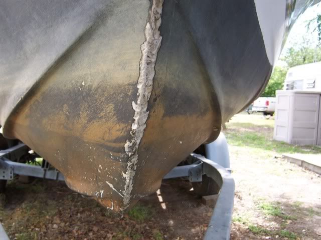 Here is a picture of my bow/keel :o :  It really is not as bad as the picture makes it look, does not leak. What would be the best way to repair this, do I have to grind it all out and re glass or is there something I can use to just cover it over?