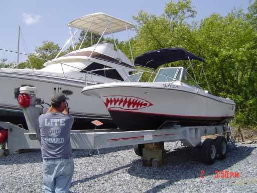 Didnt expect to take her out today, but the guy at the boat yard who helped me load her, said, LETS DO IT !!. So excuse the mess in the boat. The boat was loaded with all my tools and stuff for the trip home. She started up on the second try. Starter spun ?? She ran great, plenty of water out the exhaust, but still not as much as I wanted to see coming out of teh pee hole, New water pump coming along with new volt and water psi guage. She rode great, the motor was smooth running. My friend did notice the the motor turned sharper to one side the to the other side, about a 2 inch differnce. Might need a longer arm he said ? Still need to bolt the seats down, patch and paint inside, but I gotta tell ya all, being out there on the water, I totally forgot about the "Things to get done List" I had a big old ghrin on my face. I was loving it. The stress just dropped 75 percent. Even with the dinged up prop, she ran really well. Steering slightly stiff, but some of the wifeys sex lube and it'll be fine ;D Bad thing is I'm busy all week until Sunday. But I'll be taking her out for sure on Sunday !!!. Need to work on the enclosure and the dive platform. My booty is waiting for me out there on some unknown wreck. Enjoy all the pics. The guy driving is the yard guy.
