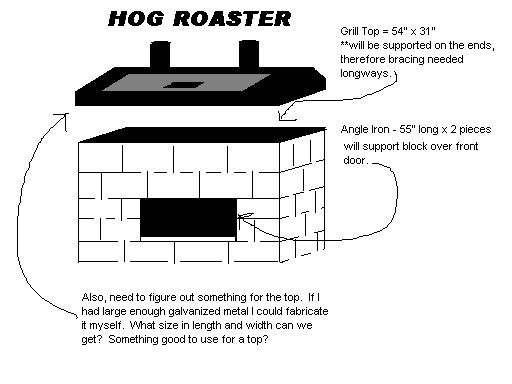 Here is the plan I drew up before I started. I later realized galvanized was not good when it comes to cooking. I have an oil barrel that I plan to cut in half, then cut a door in it and it will sit on top of the blocks perfectly.: